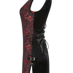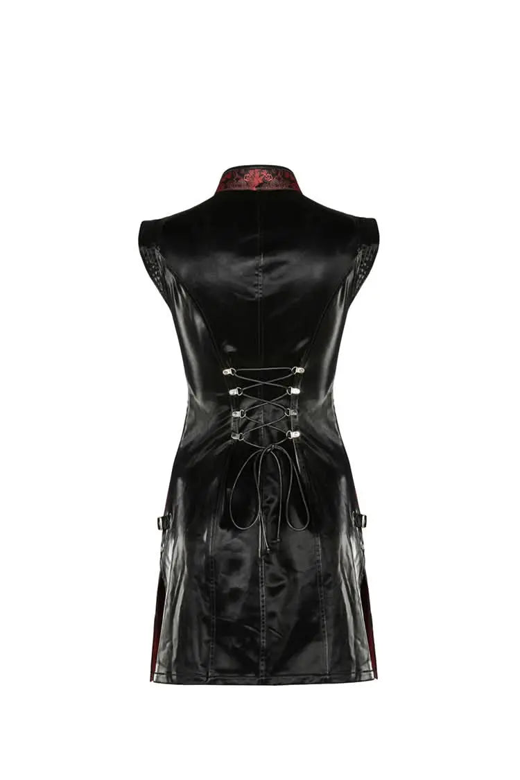 Superbe mini-robe sans manches à col mandarin avec devant en jacquard de dragons chinois et dos en cuir synthétique à lacets. Fentes latérales et fermeture à col mandarin avec ornements à boucle, jolis détails en cuir synthétique. Un mélange époustouflant de musique industrielle impitoyable et de style chinois sexy, en d'autres termes, un essentiel de la garde-robe de chaque princesse noire !!! Également disponible en noir. Coupe slim. Êtes-vous prête pour l'explosion ?!!