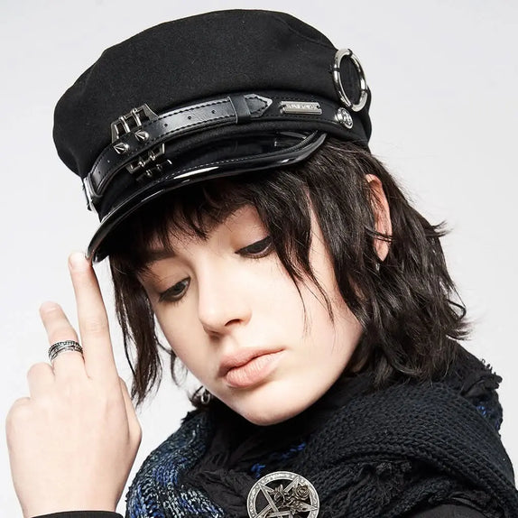 Chapeau militaire emblématique en tissu de laine avec visière en cuir PU brillant. Boucle avant décorative, clous et joints toriques latéraux. Êtes-vous prêt pour l'explosion ?!