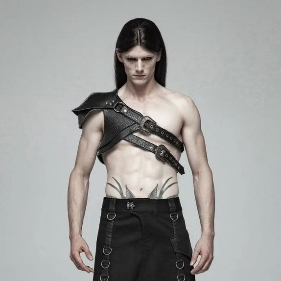 Accessoire d'épaule asymétrique en similicuir noir avec ceintures et boucles, rivets et œillets en métal bronze.