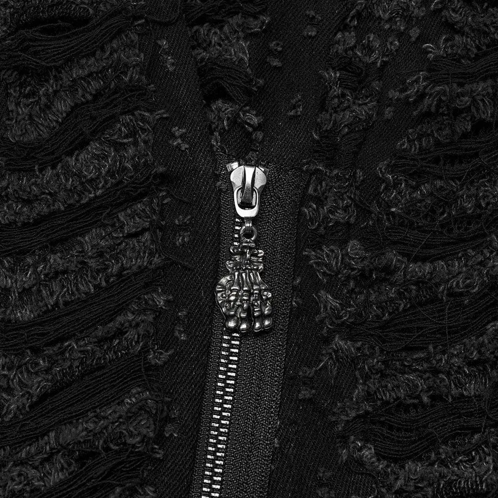 Year Zero Mesh Overcoat features full sleeves and a high neckline. It is made out of distressed mesh fabric and has a belt on the waistline along with a hood. There is a zipper on the front.