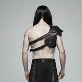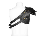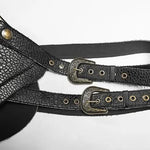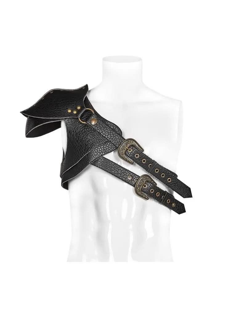 Accessoire d'épaule asymétrique en similicuir noir avec ceintures et boucles, rivets et œillets en métal bronze.