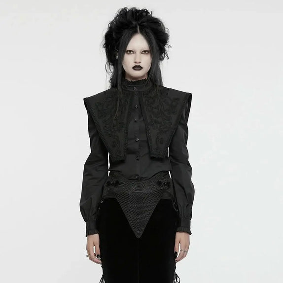 The front of the shirt is adorned with a classic button closure, offering both style and convenience. Adding a touch of drama, the waist cincher at the back creates a flattering silhouette, enhancing your natural curves with an elegant twist. Intricate embroidery details further elevate the shirt, making it a true masterpiece of gothic design.