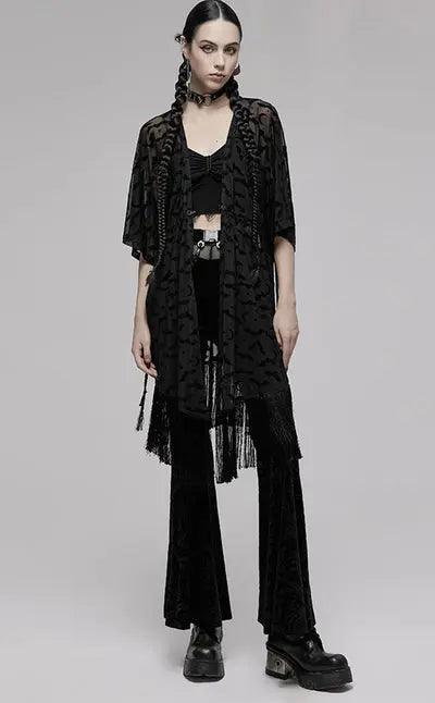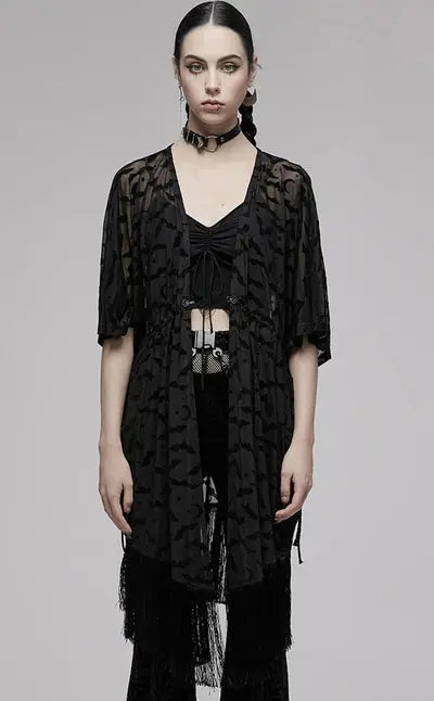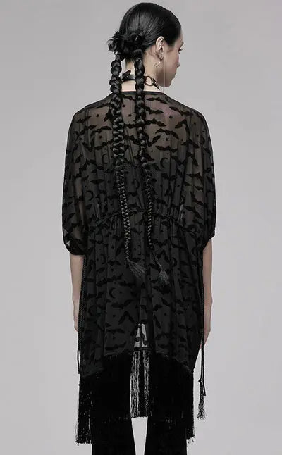 The Immolate Top is a fierce fusion of mystery and rebellion, featuring sheer mesh fabric adorned with a flocked bat pattern for a hauntingly beautiful touch.