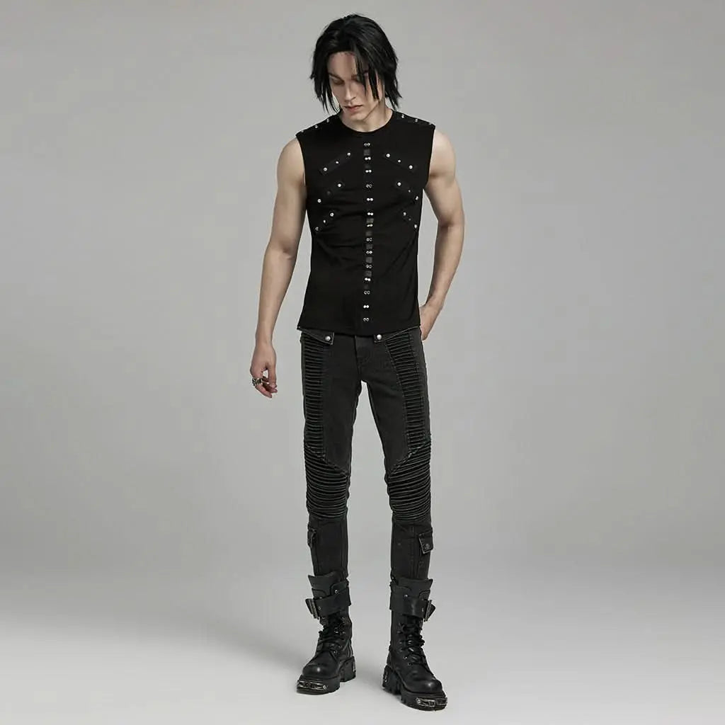 Unleash your inner darkness with the Detritus Tank Top, a must-have for any gothic wardrobe. This striking tank top features intricate mesh splicing and bold decorative rivets, combining to create an edgy yet sophisticated look. The stretchable fabric ensures comfort while maintaining an effortlessly chic silhouette, perfect for those who dare to stand out.