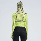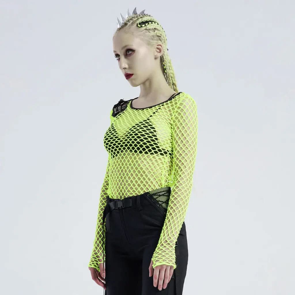 Faites un voyage spécial avec le haut slim fit Acid Trip en résille élastique vert fluo, doté d'une découpe avec deux bretelles en tissu brillant avec boucles et œillets argentés sur l'épaule gauche. Un passepoil noir brillant tout autour de l'encolure et de la découpe. Des manches longues complètent ce look spectaculaire - glissez vos doigts dans la maille et portez-les comme des gants sans doigts. Ce haut est idéal à porter sous un corset en PVC ou seul avec un pantalon bondage !
