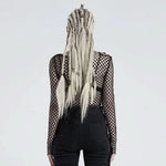 Le style Punk ou l'autoroute avec le haut slim Vicious en résille élastique noire, doté de deux bretelles en tissu brillant avec boucles et œillets argentés sur l'épaule gauche. Des manches longues complètent ce look dramatique - glissez vos doigts dans la maille et portez-les comme des gants sans doigts. Ce haut est idéal à porter sous une veste en cuir cloutée ou seul avec un pantalon bondage !